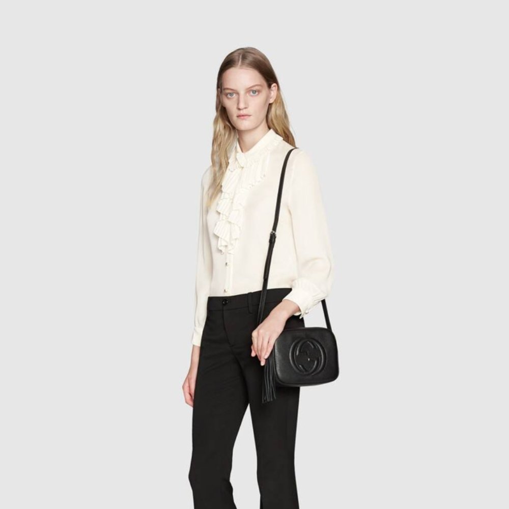 This small Gucci Soho Disco Bag is the perfect summer accessory for on-the-go moments. Crafted in black leather, this bag features the stitched GG logo, leather tassel, long comfortable strap and gold-tone hardware accents.