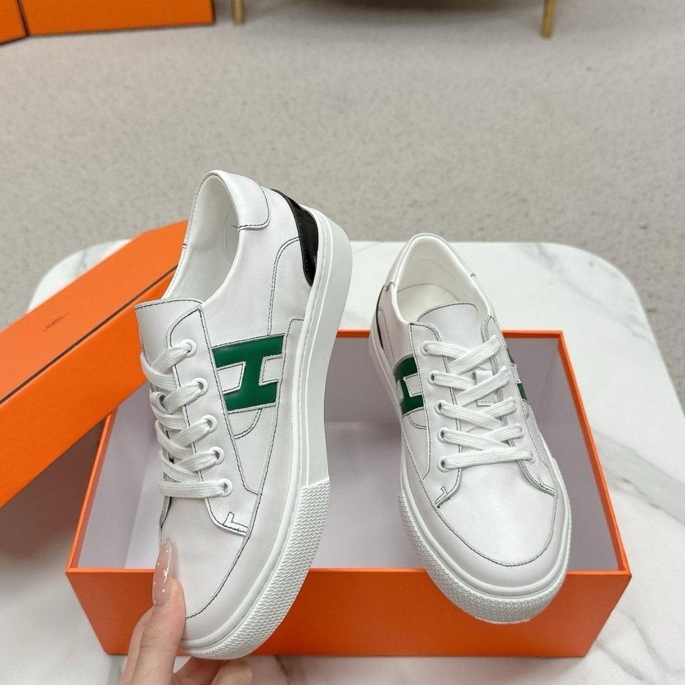 The Hermès Deep Sneaker Blanc and Vert Bouteille combines timeless elegance with a bold modern edge, highlighted by the striking H detail. Its refined silhouette and effortless comfort make it a statement of prestige, perfect for those who embody luxury in every step.