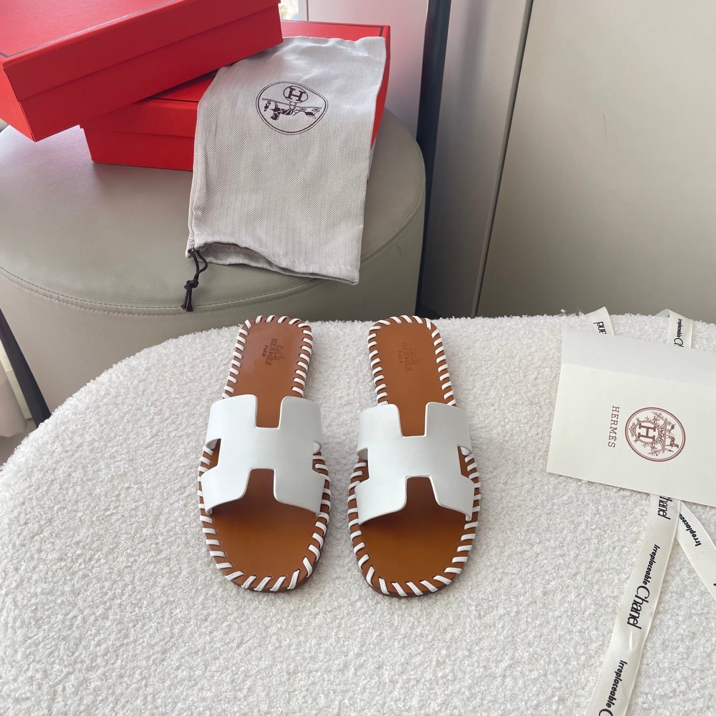 The Hermes Oran Sandals Stitching in brown and white embody timeless sophistication with their iconic “H” silhouette and refined hand-stitched detailing. Effortlessly elegant and designed for comfort, they elevate every step into a statement of prestige and modern luxury.
