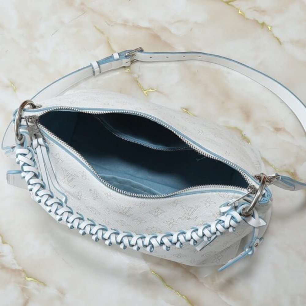 The Louis Vuitton Beaubourg Hobo MM. It features the iconic Monogram perforations on supple leather, with a braided handle and an LV leather charm. It has a double zip closure with leather details and a microfiber lining. The hobo style and removable elements make it a versatile option for various occasions.