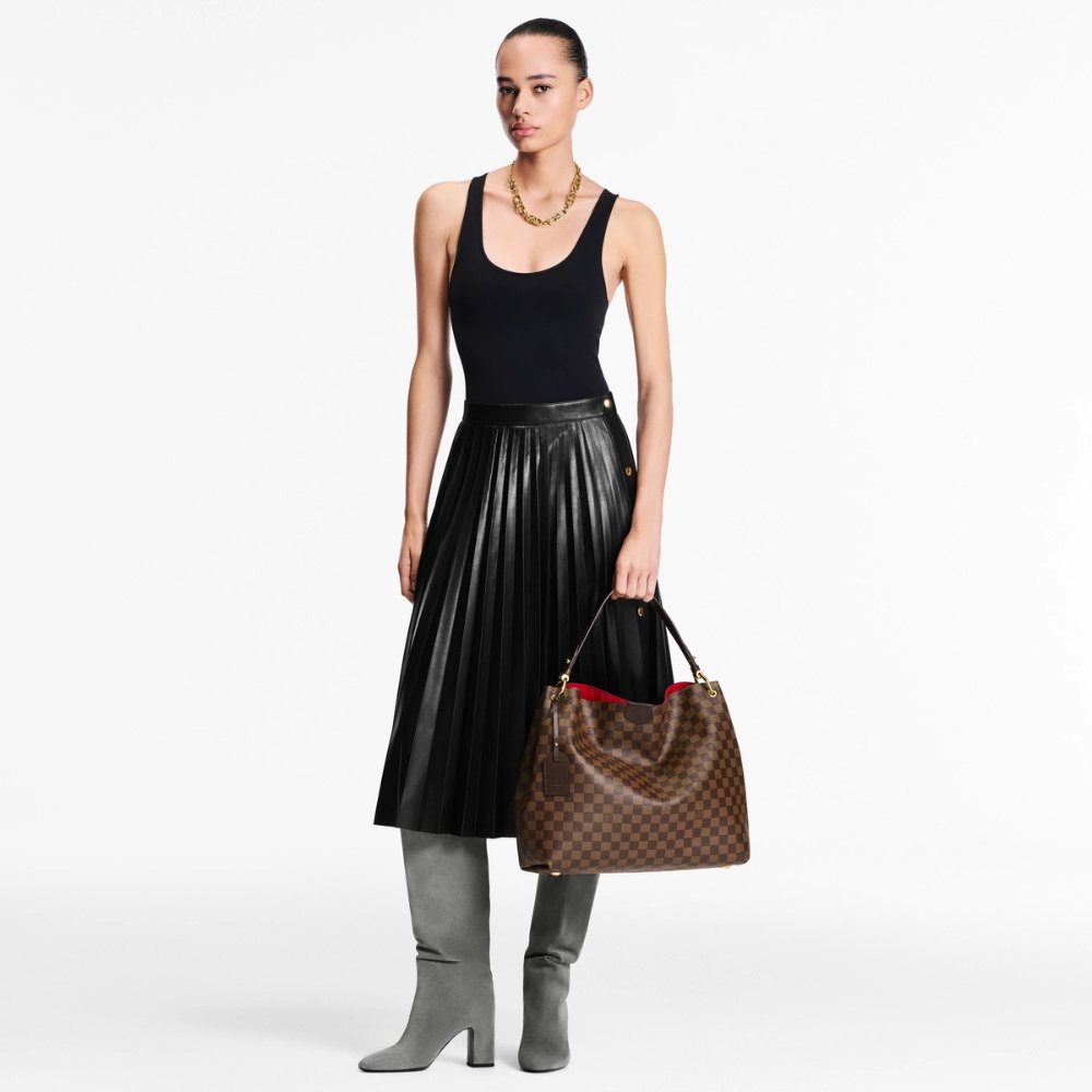 The Graceful MM hobo in elegant Damier Ebene canvas is an extra-roomy yet lightweight bag to carry every day. Natural leather detailing and shiny gold-tone hardware add a refined, signature touch. The body-friendly design combines with a supple, flat handle for stylish and comfortable over-the-shoulder wear. The magnetic closure and zipped inside pocket keep belongings secure.