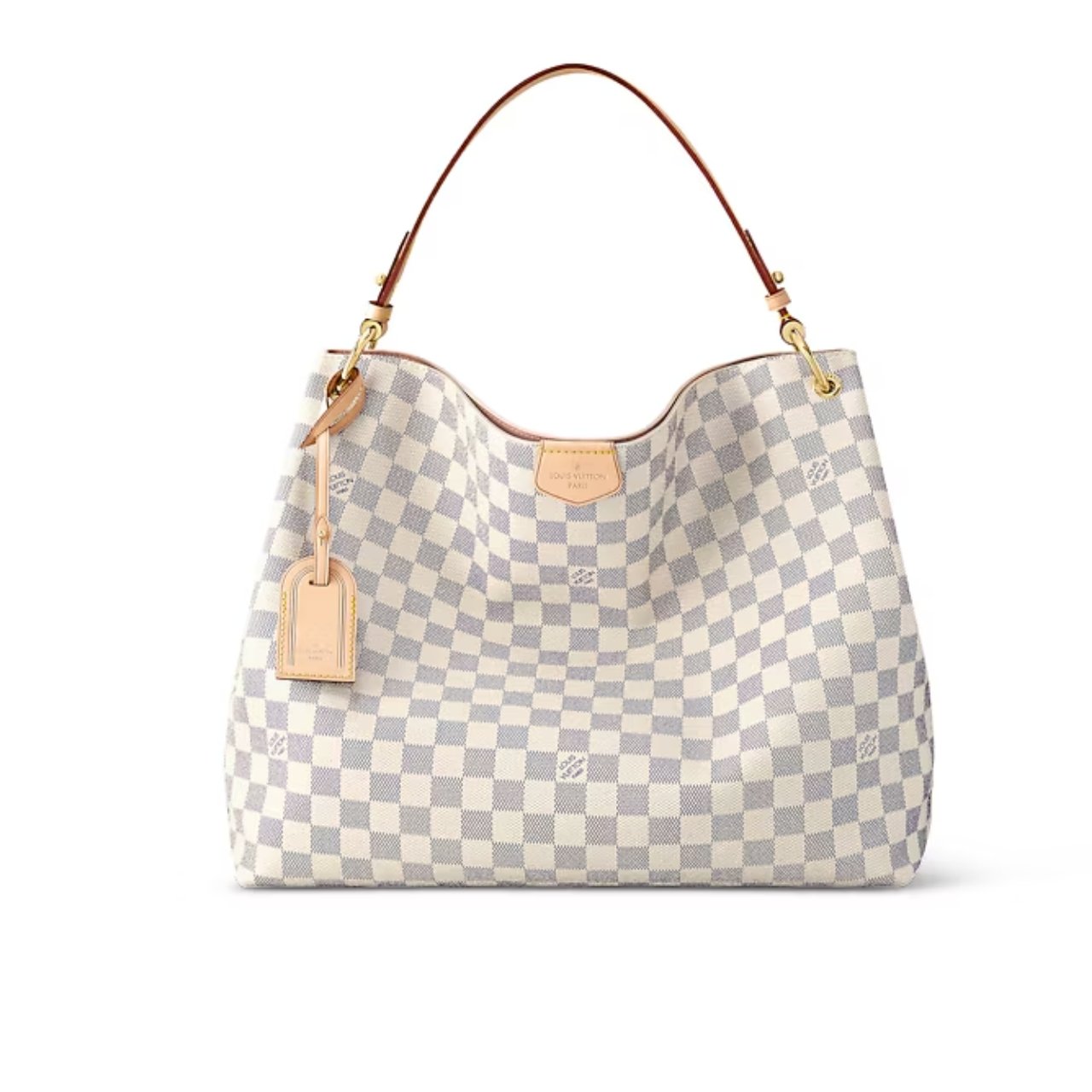 The Graceful MM hobo in fresh Damier Azur canvas is an extra-roomy yet lightweight bag to carry every day. Natural leather detailing and shiny gold-tone hardware add a refined, signature touch. The body-friendly design combines with a supple, flat handle for stylish and comfortable over-the-shoulder wear. The magnetic closure and zipped inside pocket keep belongings secure.