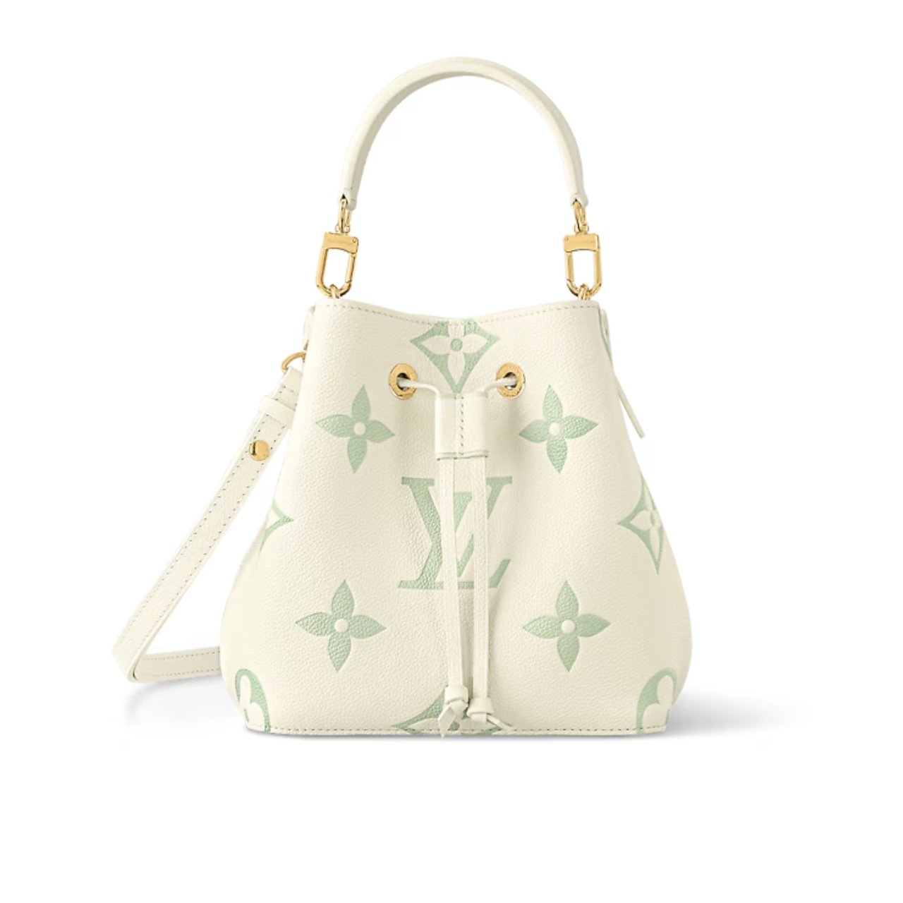 Inspired by colors of early spring, the pastel colorway of the Monogram Empreinte leather, with the LVs and Monogram Blossoms embossed and printed , bring a delicate feel to this Néonoé BB bucket bag. The interior features matching lining and a central pocket that closes with a press stud.