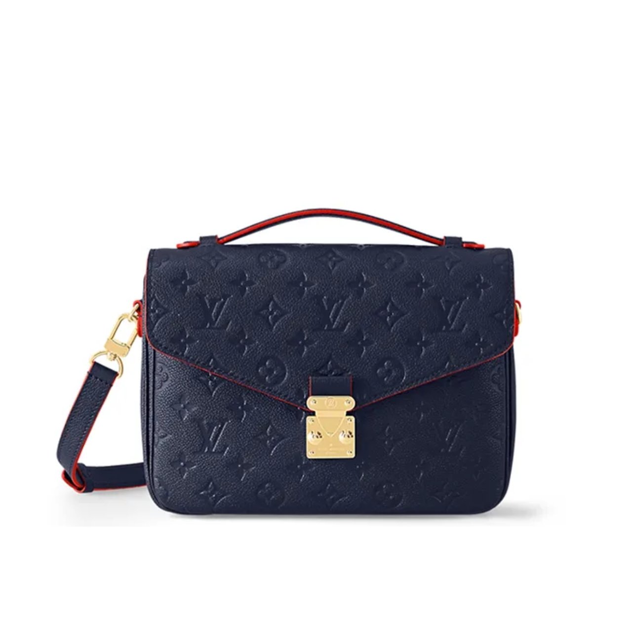 The Louis Vuitton LV Monogram Empreinte Pochette Metis is soft, and durable leather. Its design features meticulously and securely stitched lines, ensuring satisfaction even for the most discerning customers. The navy blue color with red trim offers a refined and creative look, enhanced by the embossed Monogram Empreinte pattern, which adds an elegant and eye-catching touch. It’s an ideal choice for women who love simplicity combined with sophistication and allure.