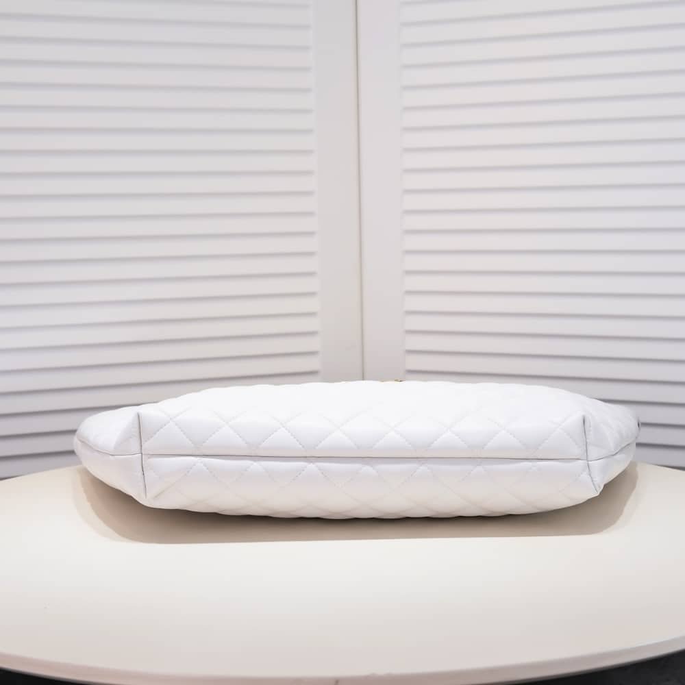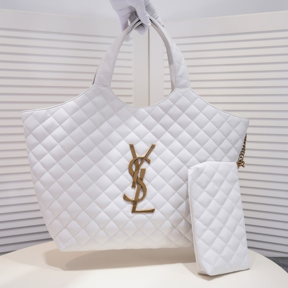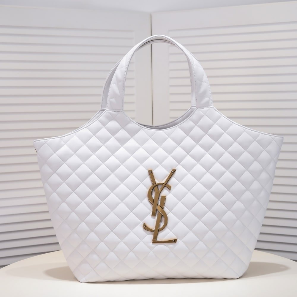 Crafted from white leather, the Saint Laurent Maxi Icare tote is defined by its oversized silhouette and diamond quilting. Featuring the iconic YSL monogram, this spacious carryall merges practicality with polished Parisian allure—an effortless companion for everyday luxury.