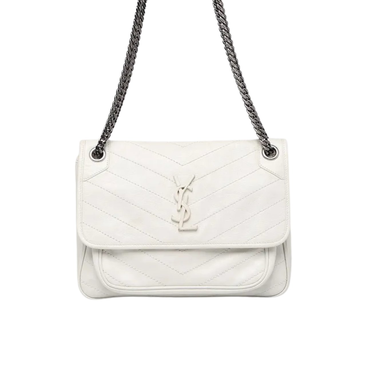 The Bag Saint Laurent Niki Medium In Vintage Leather White, with the iconic initials in leather covered raised metal on the front, this bag continues in the vein of classic French style and simplicity. This Yves Saint Laurent Quilted Crinkle Leather Medium Niki Bag features crinkled leather that can be worn on the shoulder or crossbody. The interior is large enough to fit your small essentials.